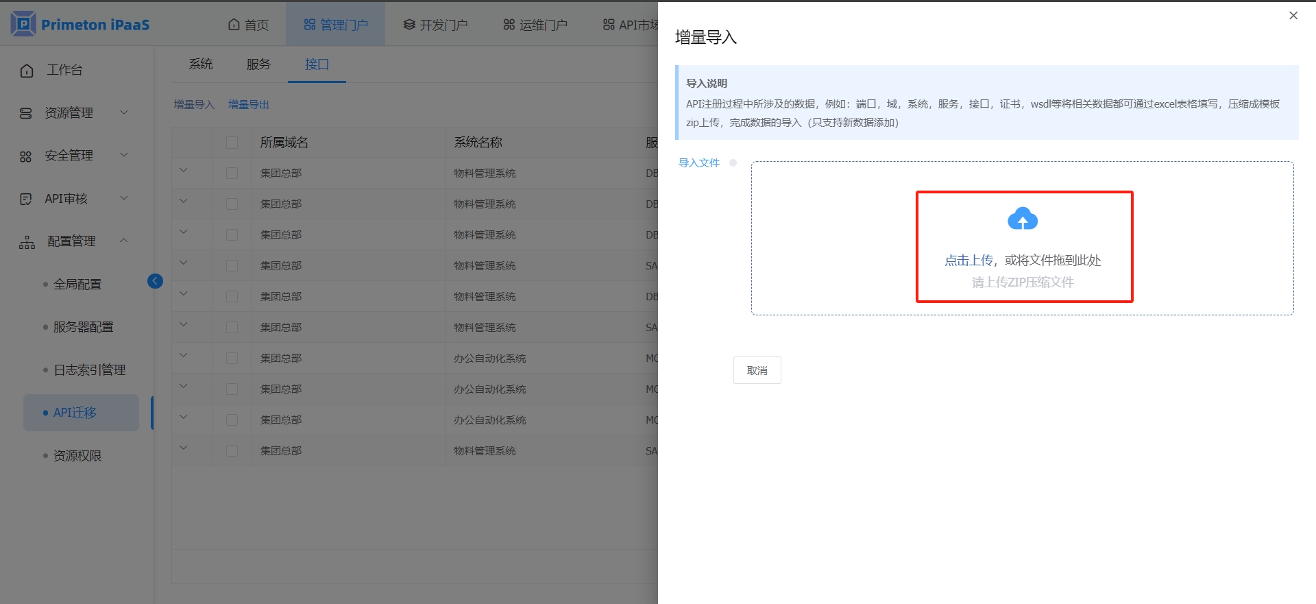 使用管理员账号登录生产环境,点击“管理门户->配置管理->API迁移”,进入API迁移页面,点击接口页签,点击“增量导入”按钮,弹出增量导入页面。