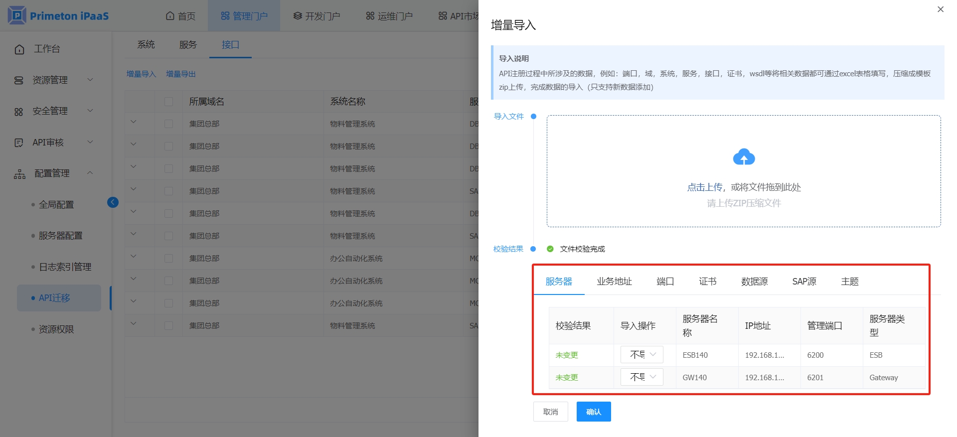增量导入时会校验接口使用的服务器、业务地址、端口、数据源的环境配置,展示校验结果。