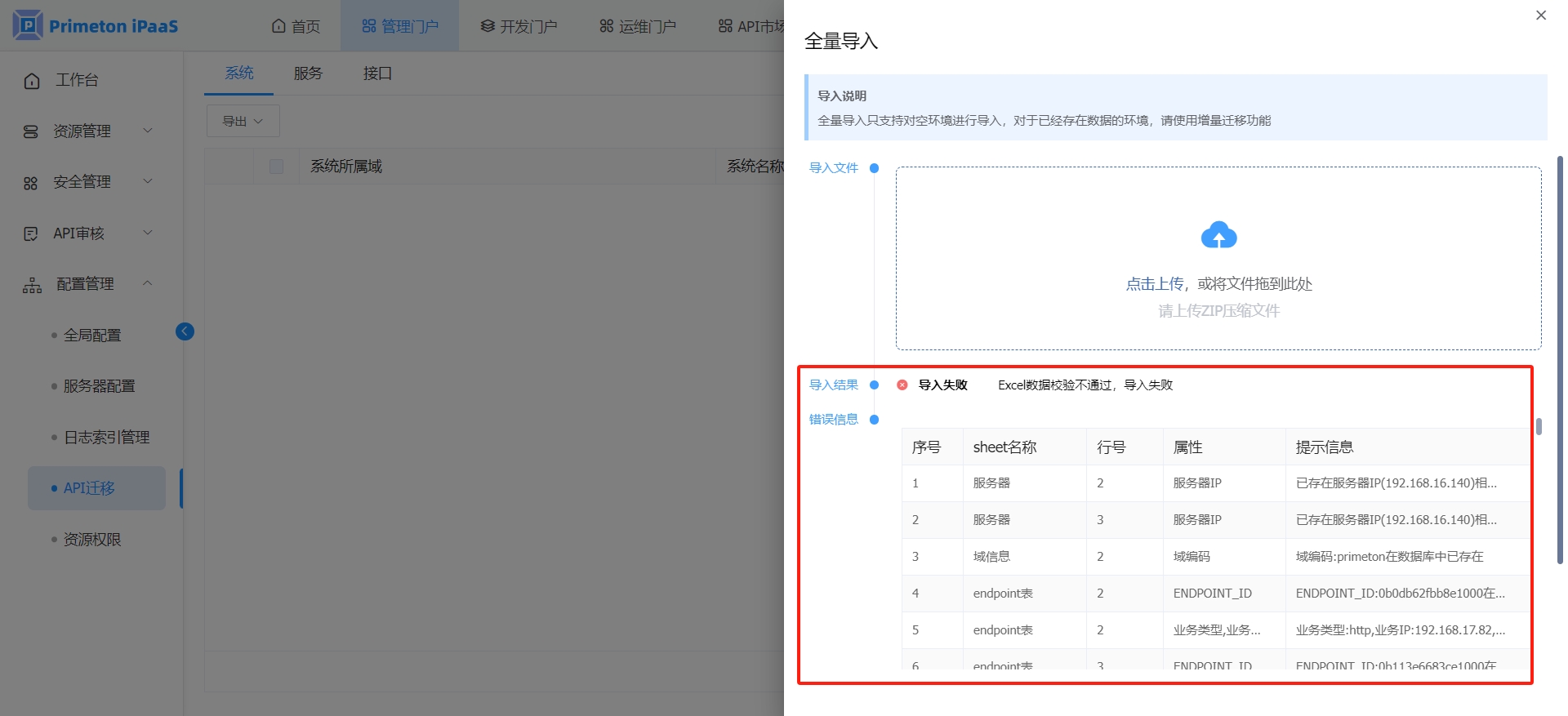如果生产环境已有数据,重复导入全量数据,或者数据不完整时,会导入失败,并返回错误信息。