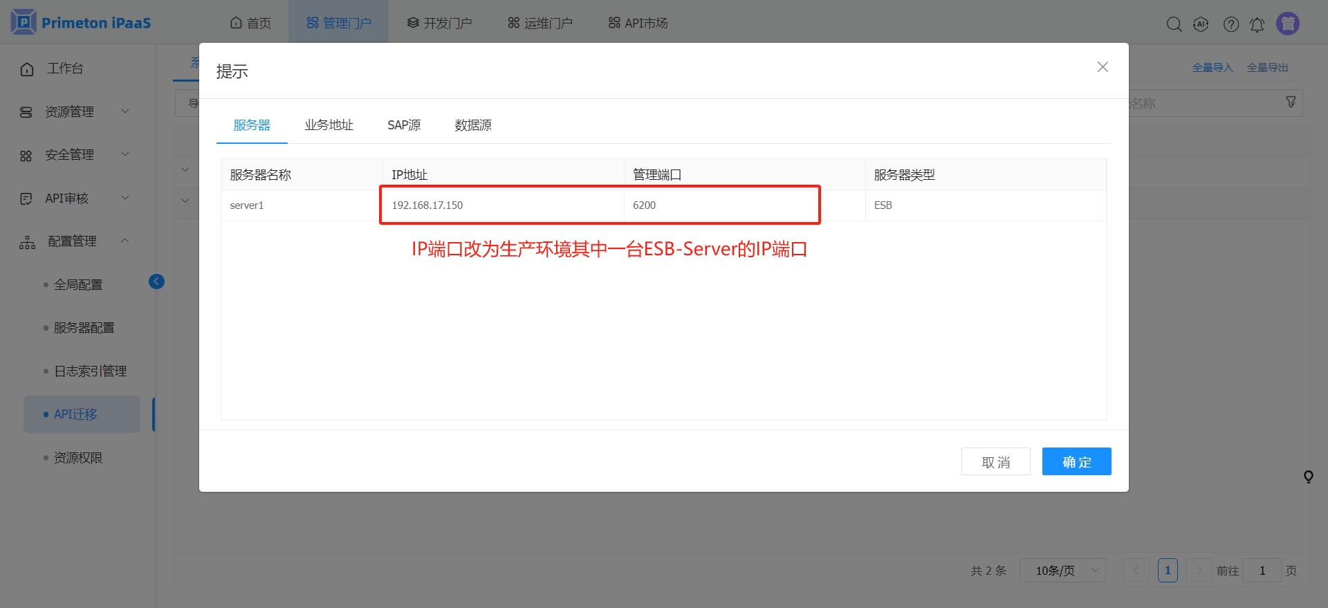 导出时,在资源环境配置页面,在服务器页签,将ESB-Server的IP端口修改为生产环境其中一台ESB-Server的IP端口。然后点击“确定”导出全量数据。