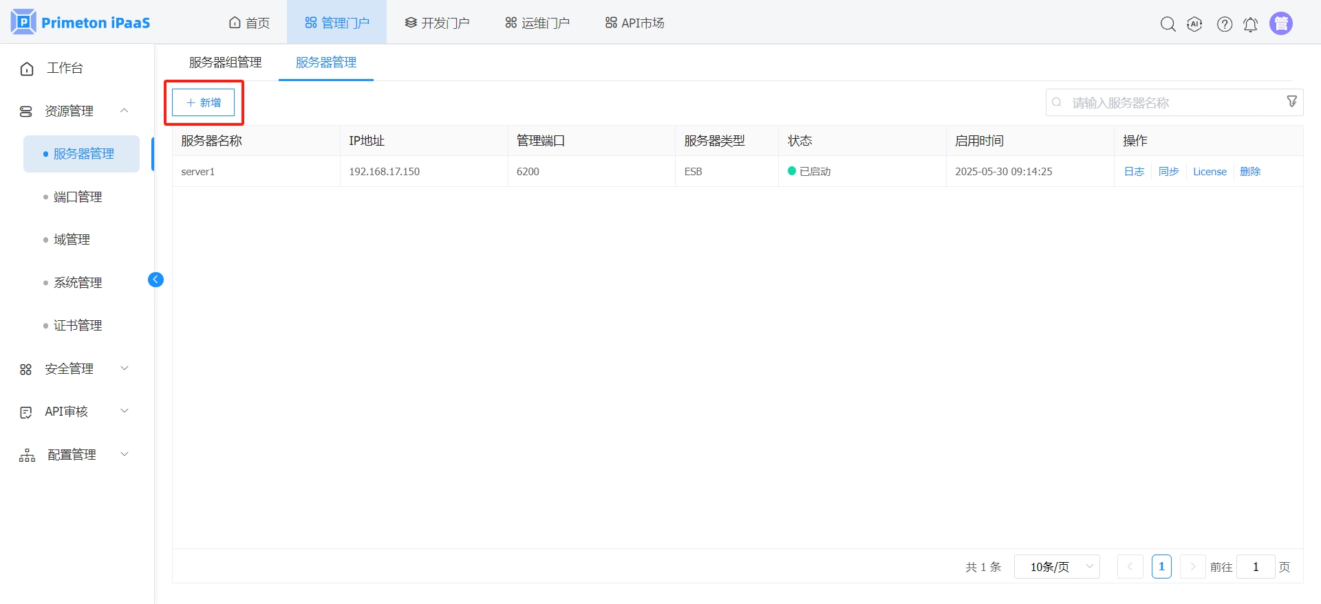 在生产环境导入成功后,在服务器管理页面,只保留生产环境的ESB-Server服务器,删除其他ESB-Server服务器。然后在生产环境的ESB-Server服务器操作列,点击“同步”按钮,同步服务器。