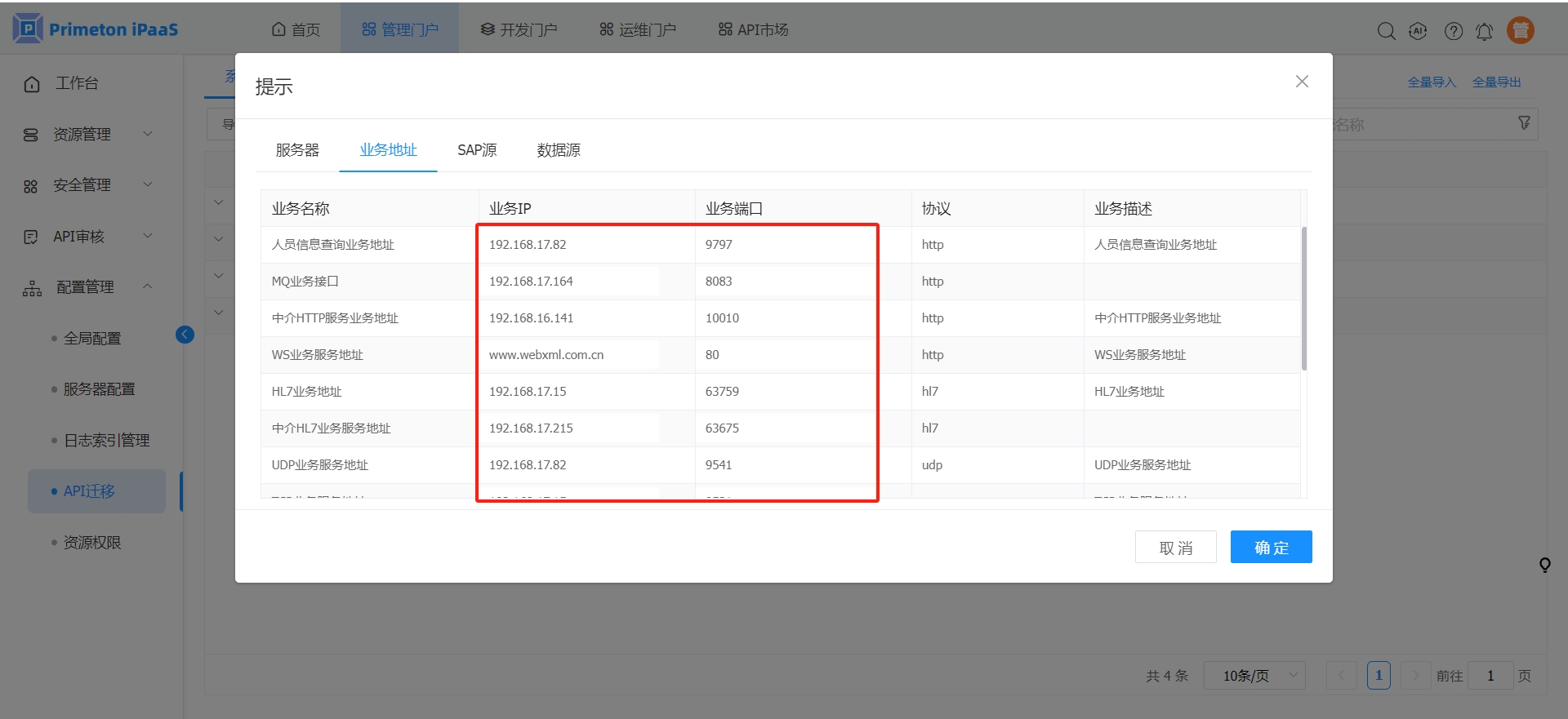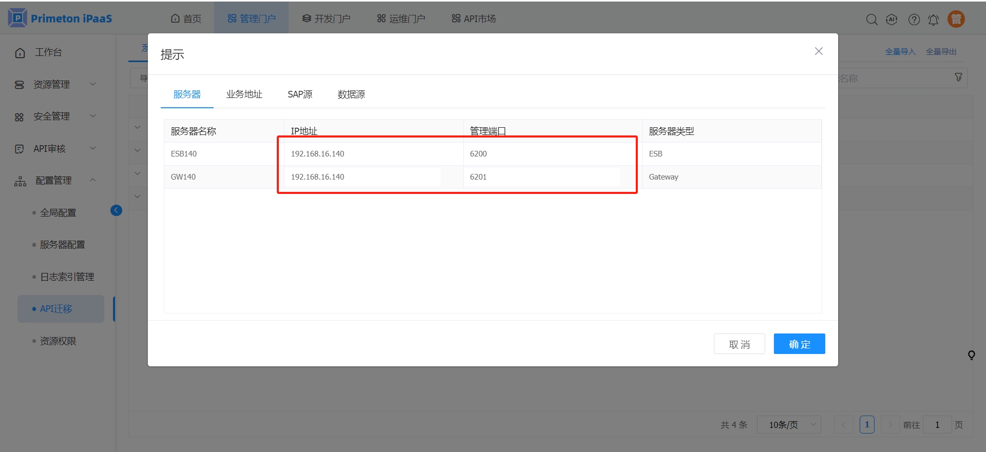 使用manager账号登录测试环境,点击“管理门户->配置管理->API迁移”,进入API迁移页面,在右上角点击“全量导出”按钮,弹出修改资源环境配置页面。