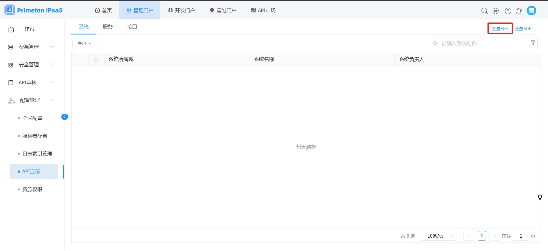 使用manager账号登录生产环境,点击“管理门户->配置管理->API迁移”,进入API迁移页面,在右上角点击“全量导入”按钮,弹出全量导入页面。