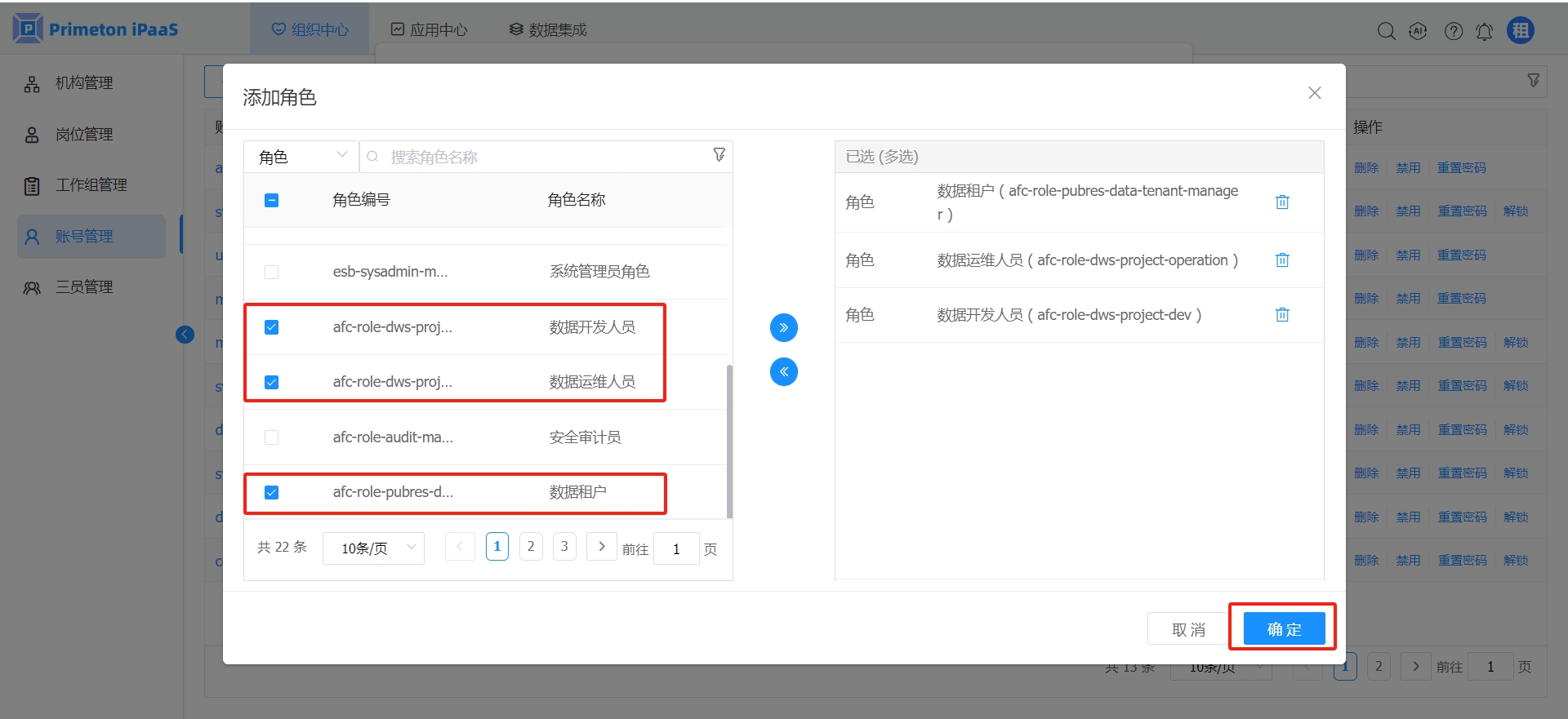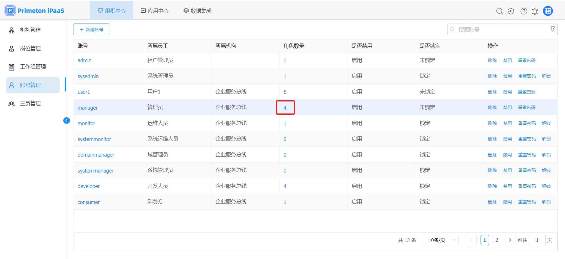 浏览器访问http://nginx-ip:nginx-port/, 用admin账号登录。进入“组织中心->账号管理”页面,为manager用户添加角色。