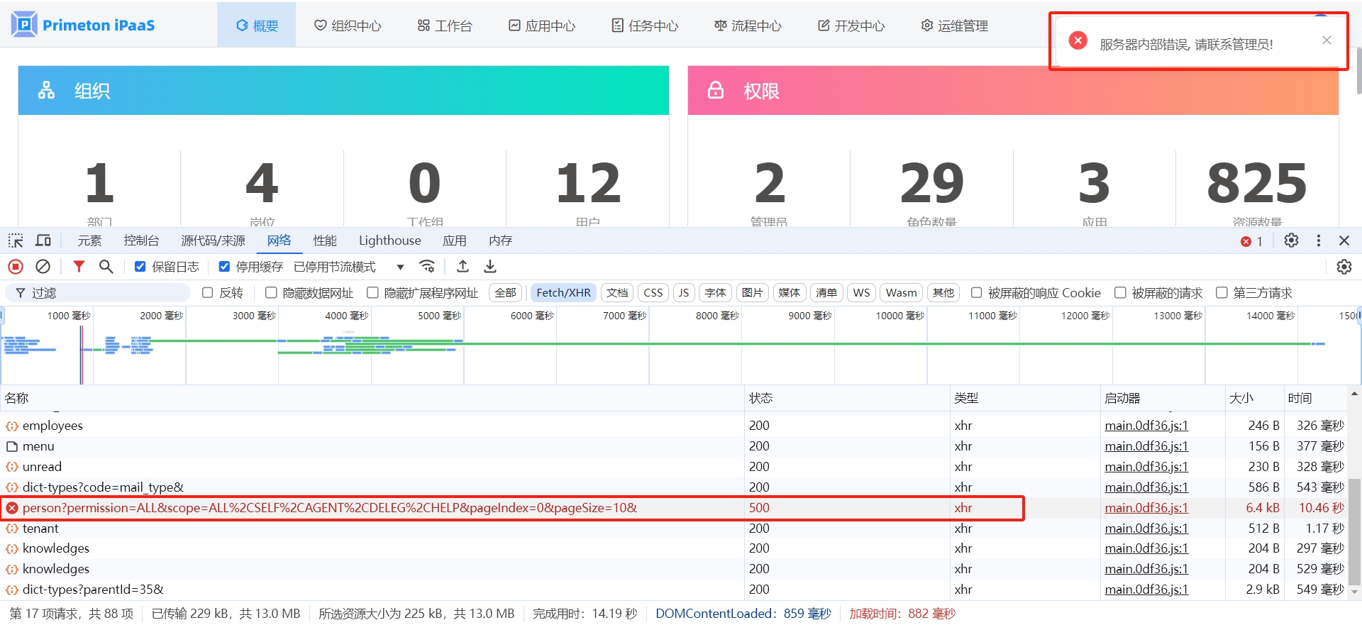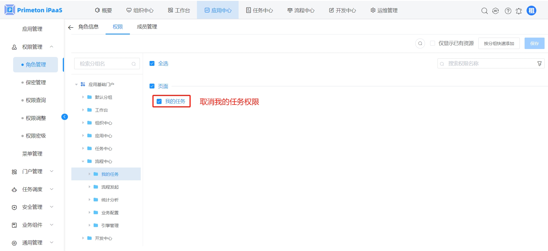 报错原因是连接BPS服务失败,iPaaS不需要配置BPS服务,在“管理平台->应用中心->权限管理->角色管理”,取消“租户管理员”角色的如下权限: