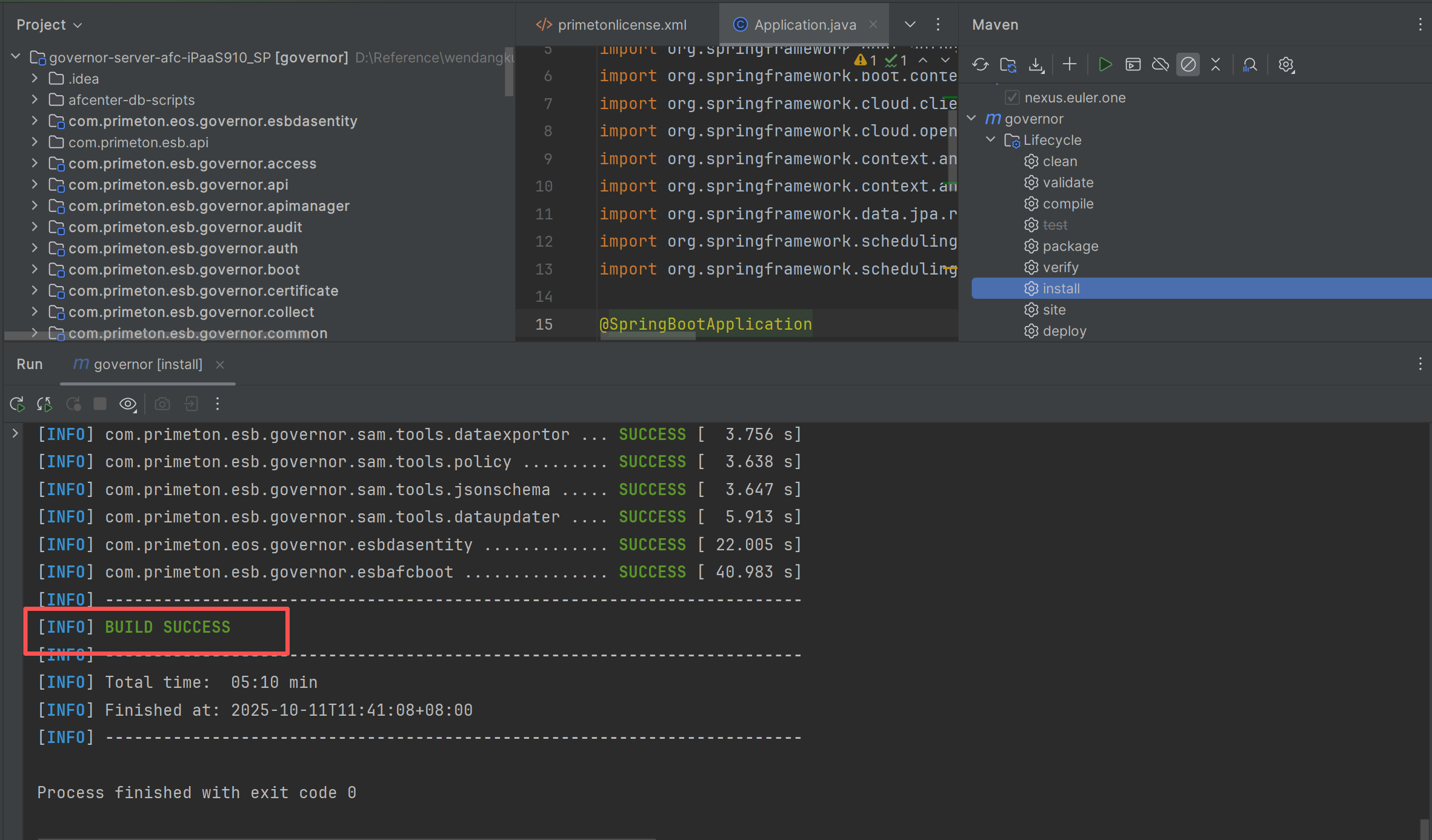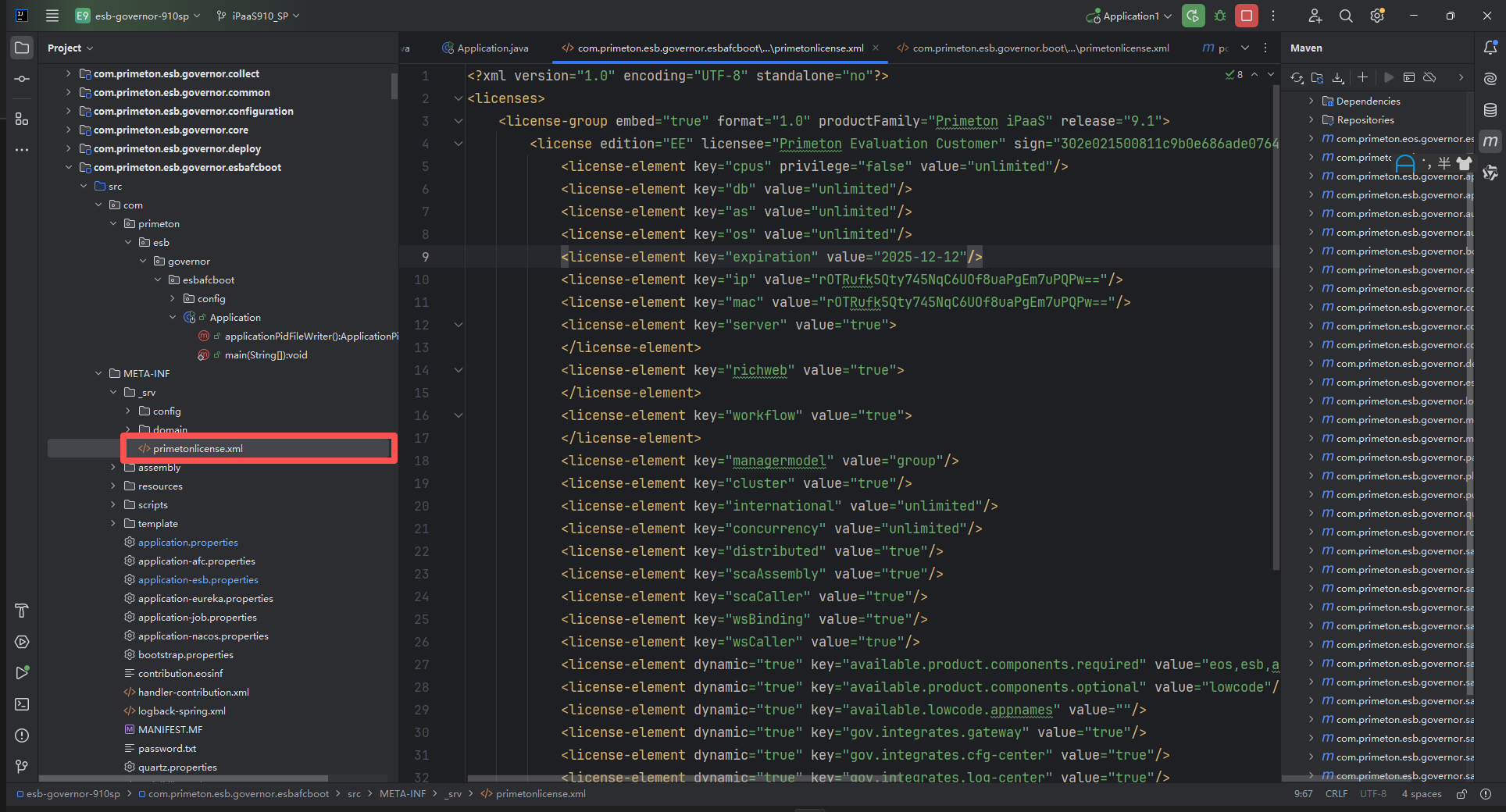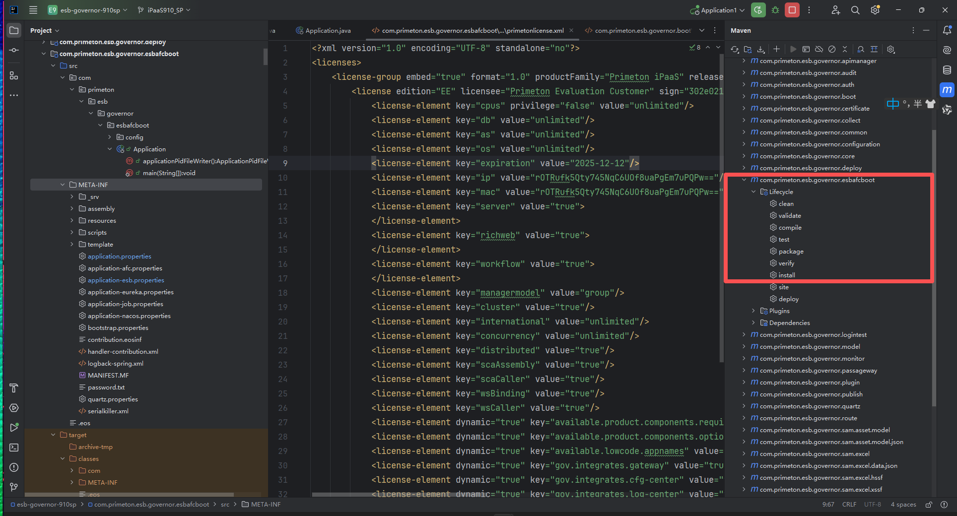 运行com.primeton.esb.governor.esbafcboot 模块下Maven clean、compile或install,更新target,确保修改的配置和license生效。
