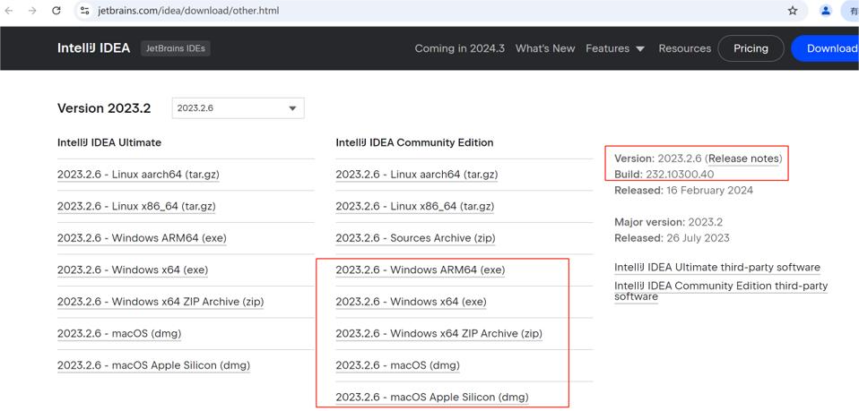 推荐使用已验证的2023.2.6版本,即Build:232.10300.40 从jetbrains的官网,下载对应版本的介质并安装,注意下载和机器的操作系统和架构匹配的介质 如:2023.2.6版本(Build:232.10300.40)