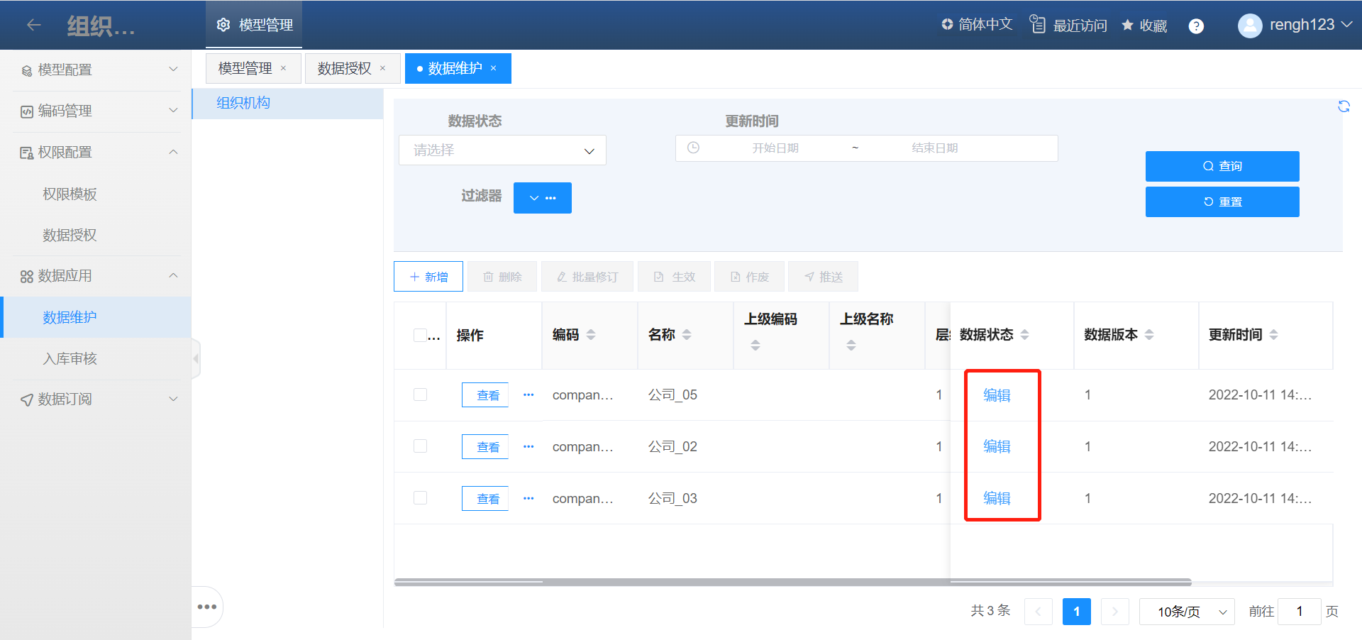 同普通模型,若该模型为需要数据审核的模型,需要勾选编辑状态数据后,点击【送审】按钮提交审核。