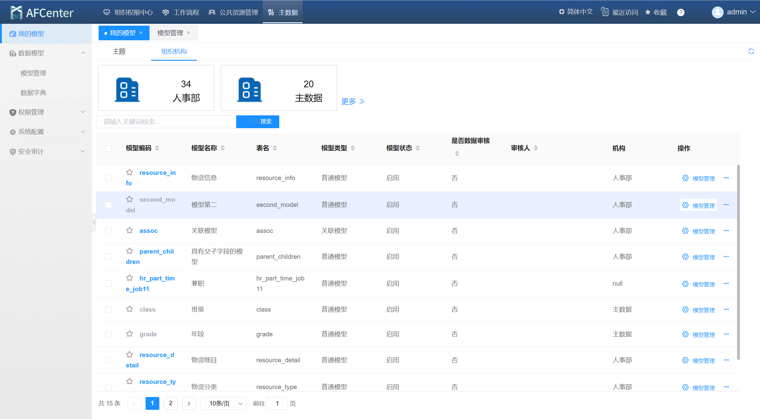 左侧菜单点击【我的模型】,可以按照【主题】维度或者【组织机构】维度一览被授权或创建的模型,其中展示数量包括未发布模型。