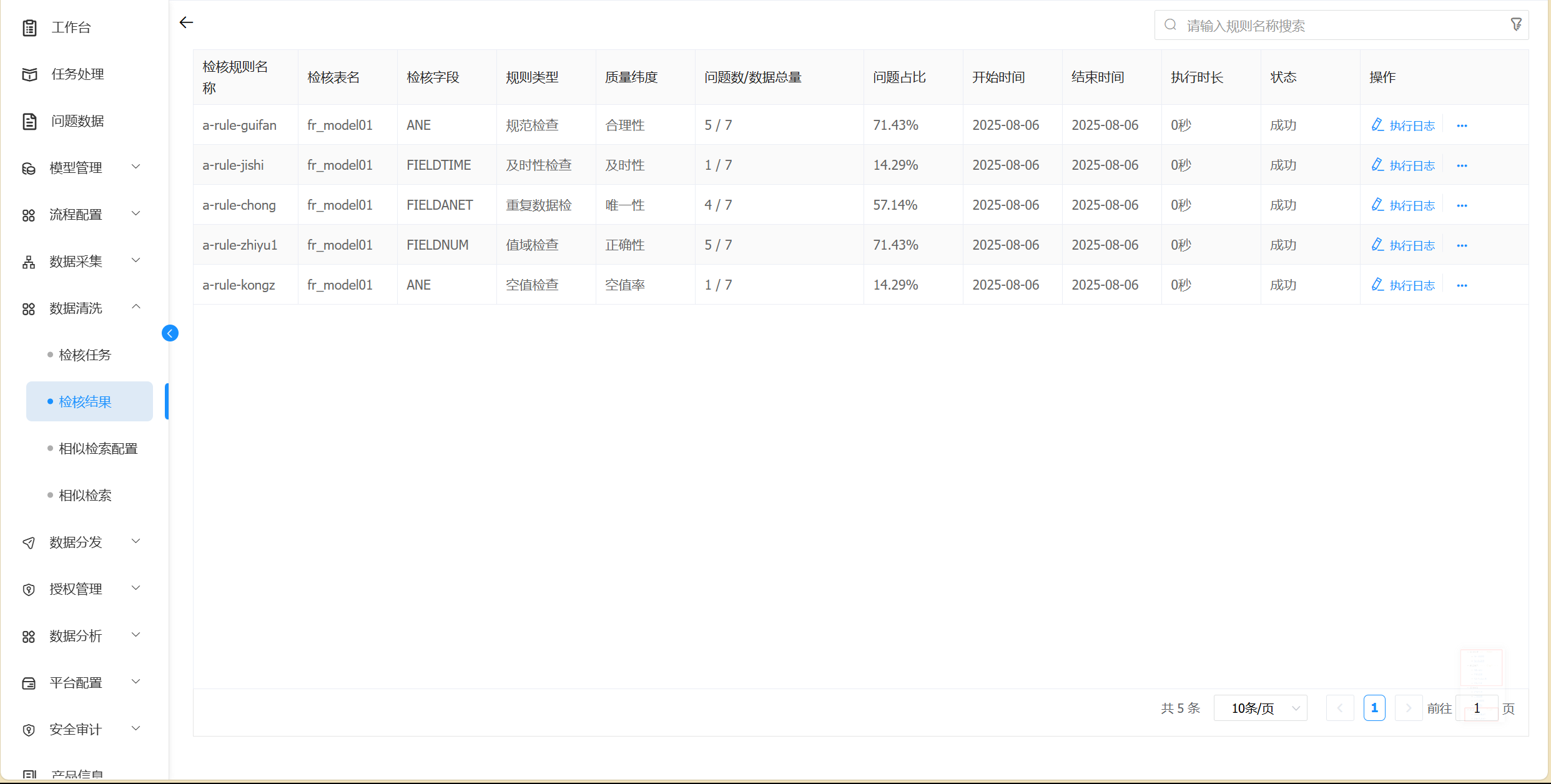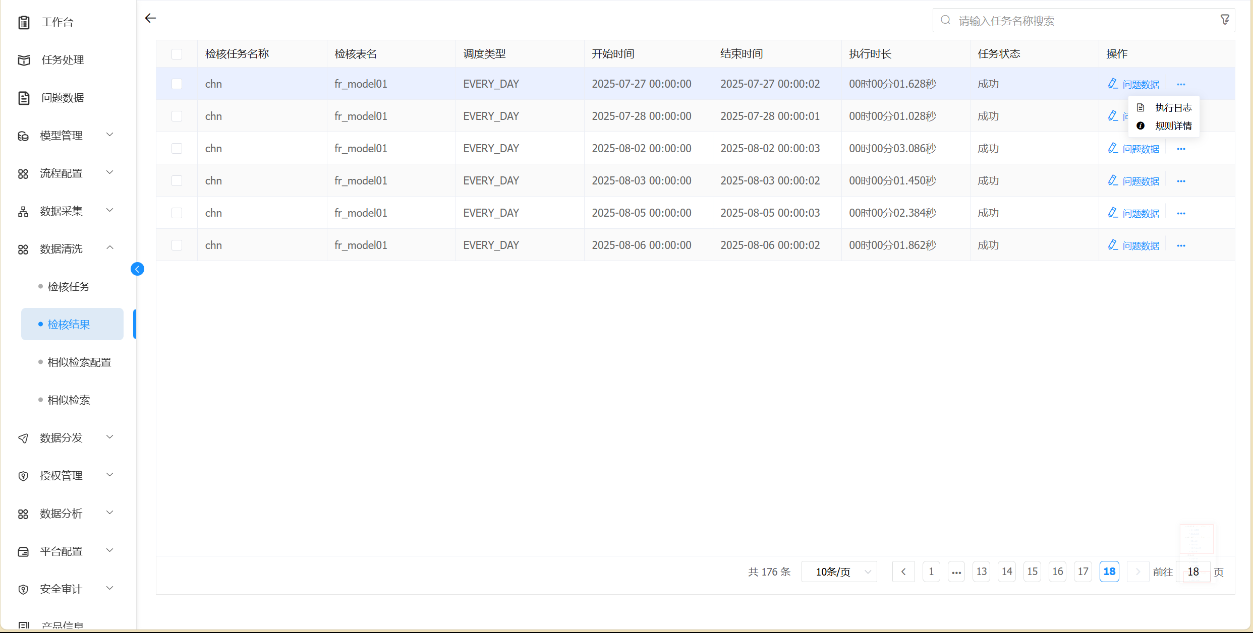 调用检核任务执行所选的检核规则后生成检核结果,检核结果主要用于反映检核任务的执行情况,同时针对检核结果中的问题数据,可以进行修正更新。