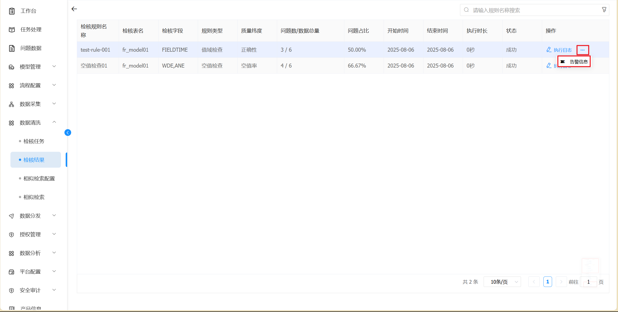 访问路径【主数据管理门户】→ 【数据清洗】→【检核结果】进入检核结果页面。