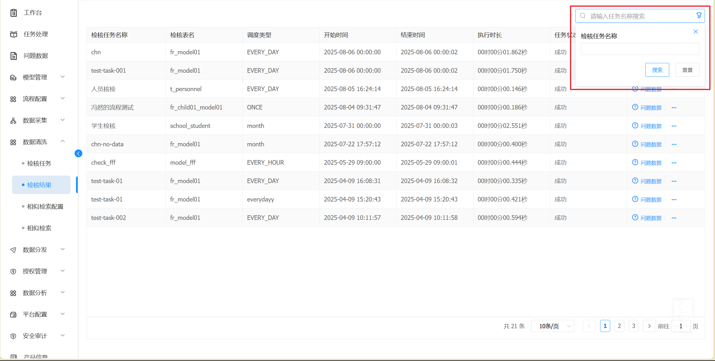 在检核任务结果页面,点击右上角搜索功能,可以对检核任务结果进行搜索