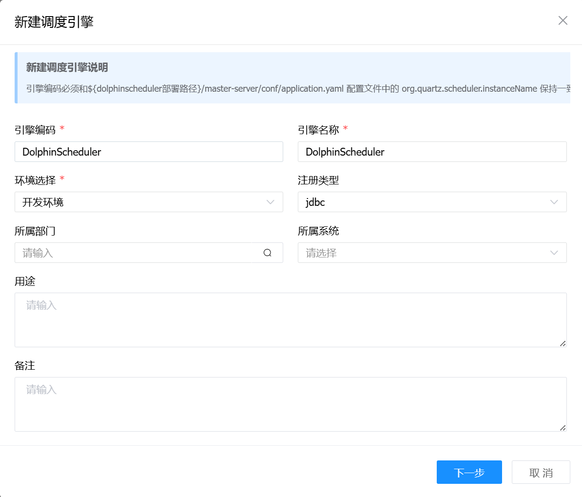 新建调度引擎时需要注意调度引擎说明。