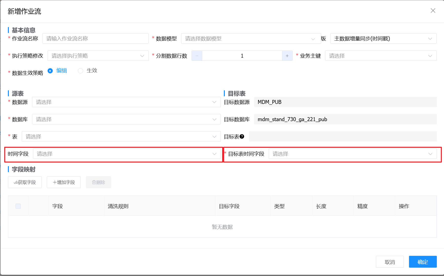 时间字段和目标表时间字段:当作业流模板为【主数据增量同步(时间戳)】时,选择【源表】中【时间字段】大于【目标表】中【目标表时间字段】中最新值的数据进行同步。