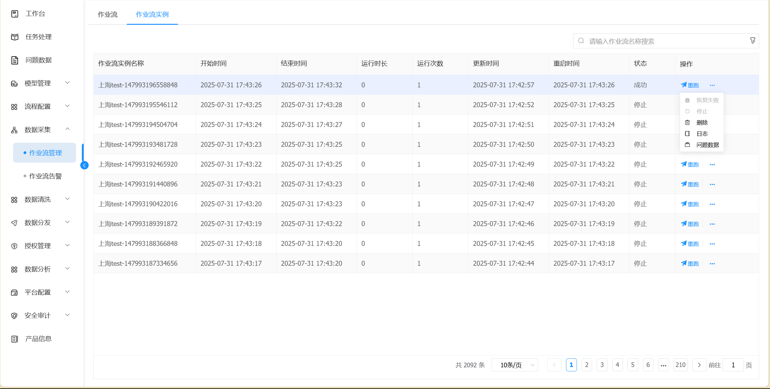 用户可以对作业流实例的执行重跑、恢复失败、暂停、停止、删除、运行图等操作。