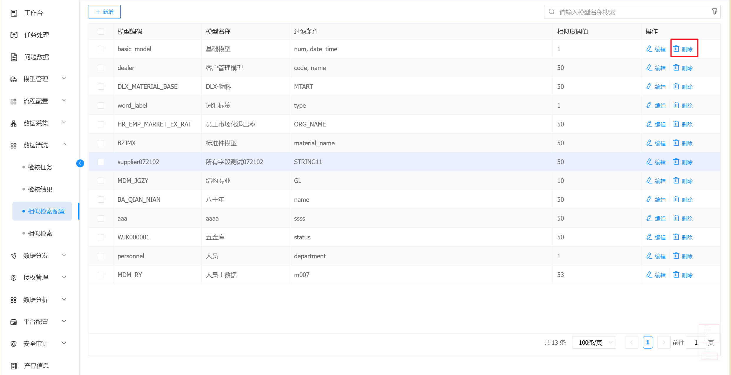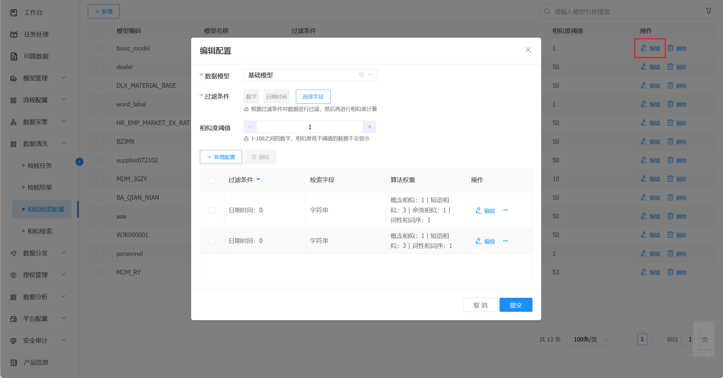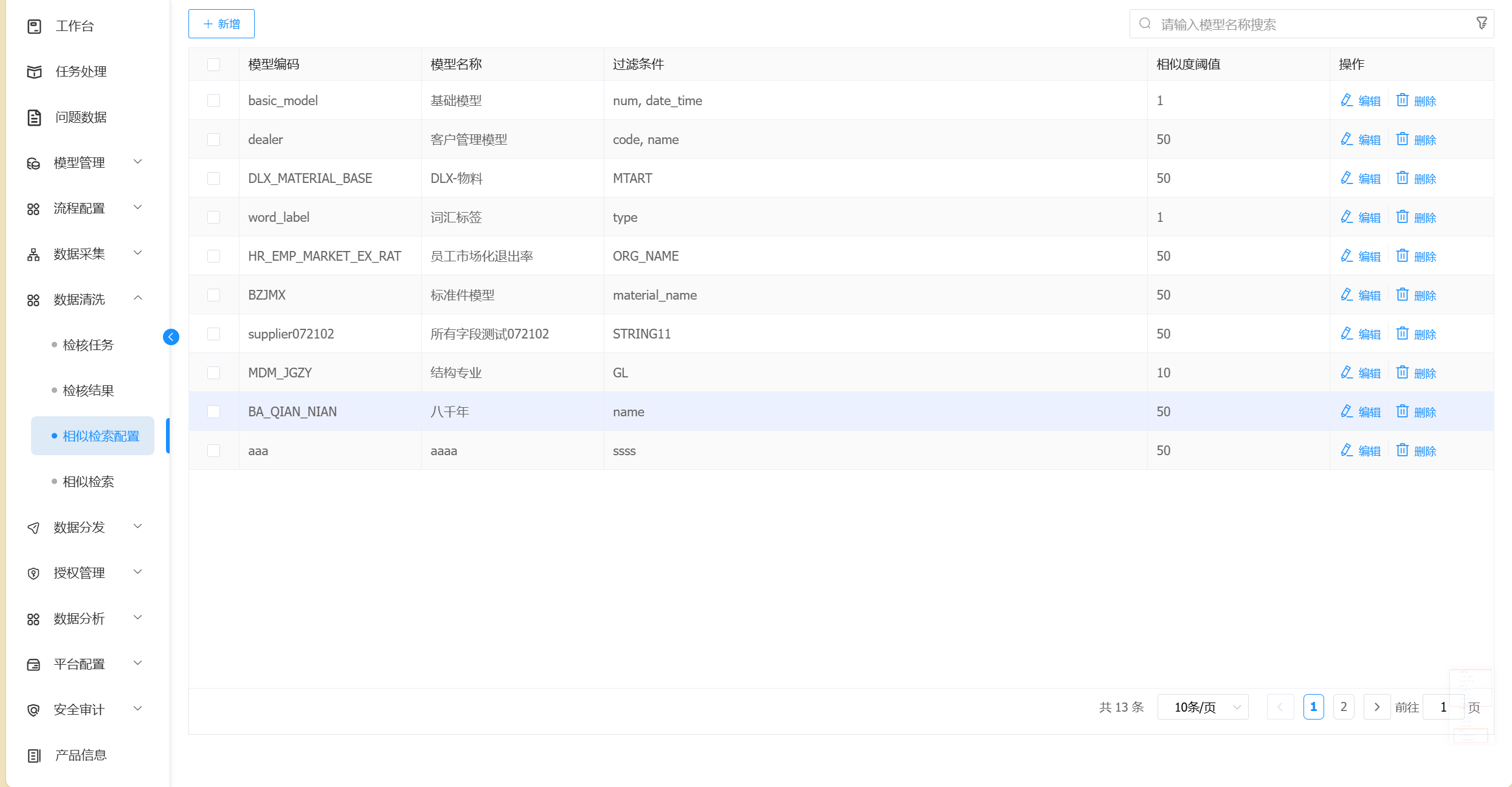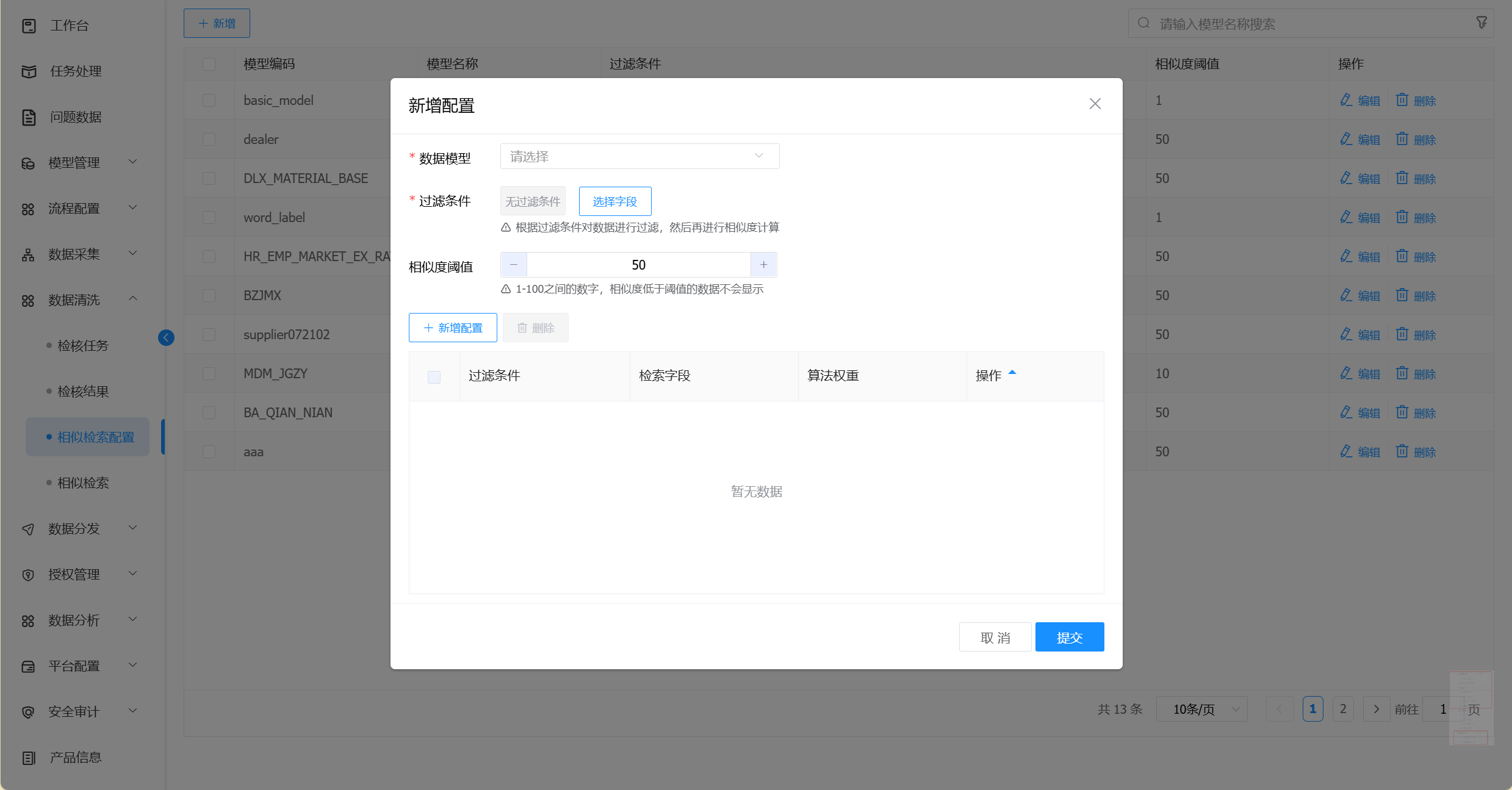 访问路径【主数据管理门户】→ 【数据清洗】→【相似检索配置】进入相似检索配置页面。