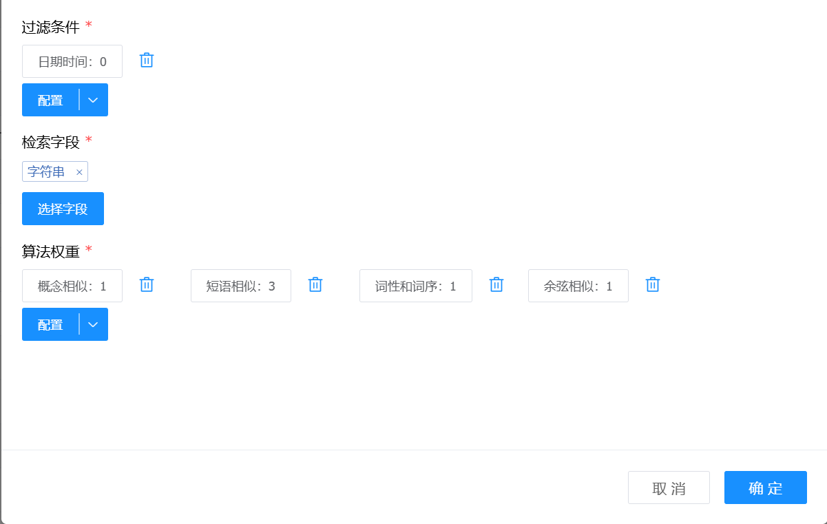| 过滤条件 | 选择数据模型字段,根据过滤条件对数据进行过滤,然后再进行相似度计算。 |